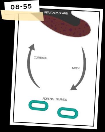 Kot je omenjeno zgoraj, se hipofiza nahaja na bazi možganov in je odgovorna za proizvodnjo ACTH, ki sproži proizvodnjo kortizola v nadledvičnih žlezah.