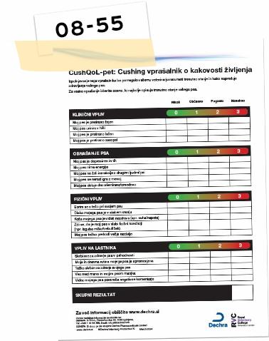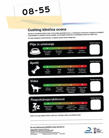 Ker so klinični znaki (simptomi) Cushingovega sindroma ključni za spremljanje je bilo orodje Cushing klinična ocena razvito tako, da preprosto beležite in spremljate najpomembnejše simptome. Priporočljivo je, da rezultat izpolnite pred vsakim obiskom veterinarja in z njim delite rezultate.